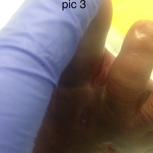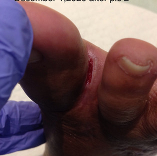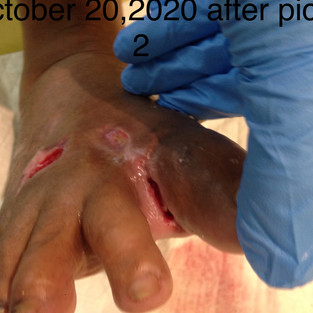 Ultrasound assisted debridement with Prontosan was done every treatment session. The wound responded well to treatment and infection was controlled early. Granulation tissue developed quickly and wound edges contracted steadily. Full healing of the multiple wounds was achieved in 3 months.